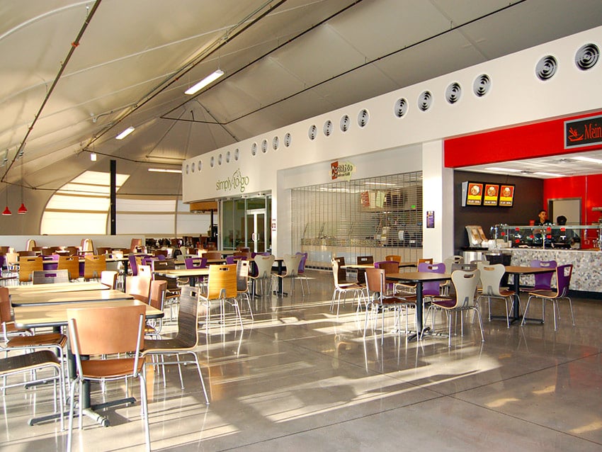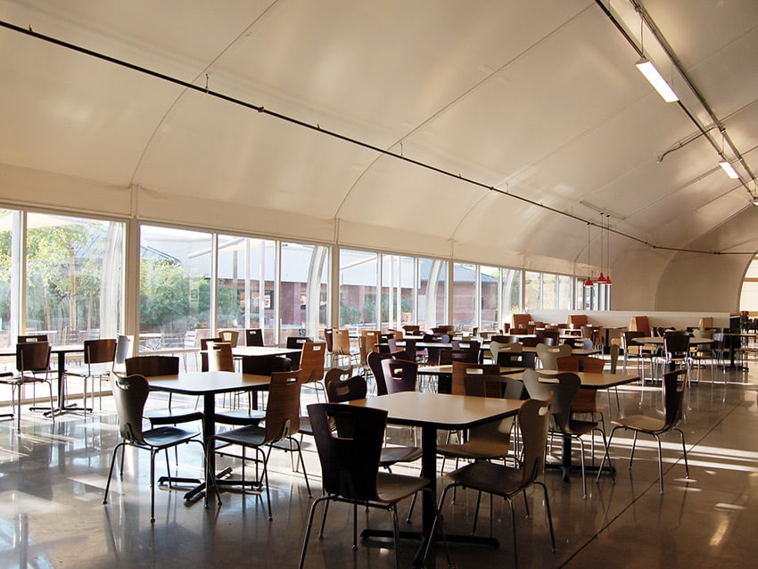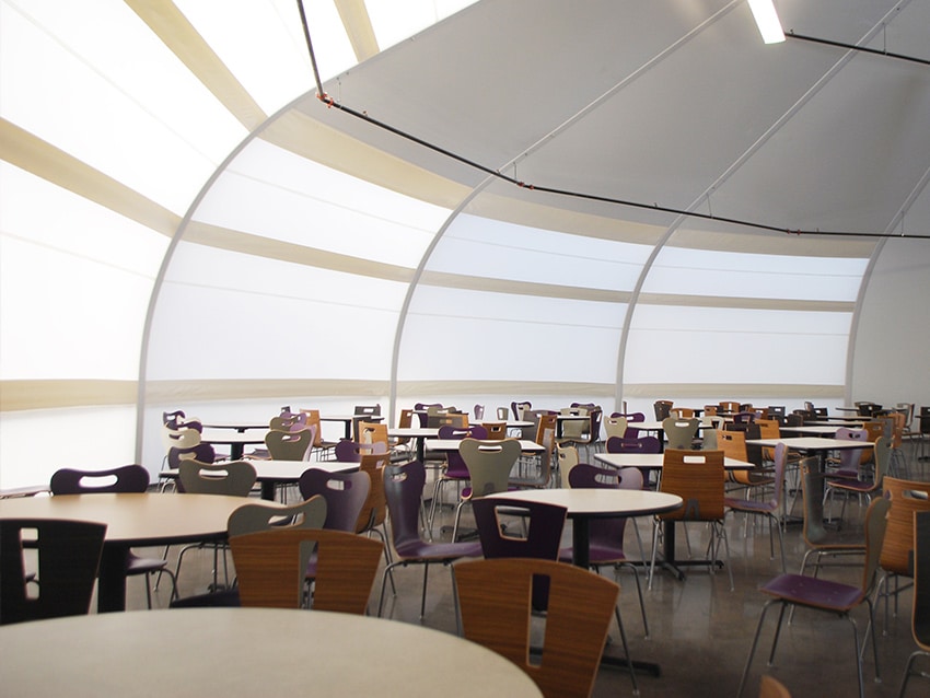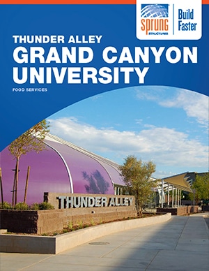 While the need for additional dining space on campus was high, speedy completion of the four-story facility was challenging due to the number of other construction projects already underway. So, stakeholders determined that the best course of action was to build the first floor of the new dining building, then house it under a Sprung structure for interim use. While other solutions were considered, the Sprung structure was chosen for its creative design, speed of construction and lower overall project costs.